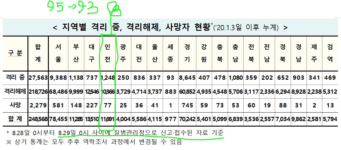[2021/08/29/0]코로나19인천지수: 확진11,691명*(전일대비 추가 93명:지역감염 91명, 해외유입 2명) * 사망 추가 1명(총 77명) [2021/08/29/0]코로나19인천지수: 확진11,691명*(93명:해외2명,지역91명),격리1,248명(-27명),완치퇴원10,366명(119명),사망77명(1명) [전국] 코로나19 사망: 전일대비 추가 3명(누적 2,279명, 치명율 0.92%). 2020. 1. 3. 이후. [질병관리청]