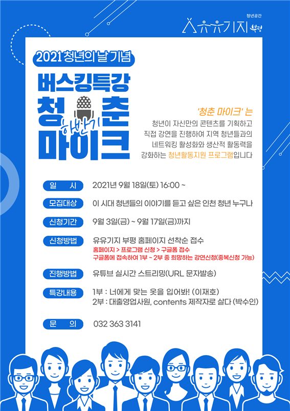 청년공간 ‘유유기지 부평’이 오는 18일 청년의 날을 맞아 실시하는 청년 버스킹 특강 ‘청춘마이크’에 참여할 청년들을 모집한다.