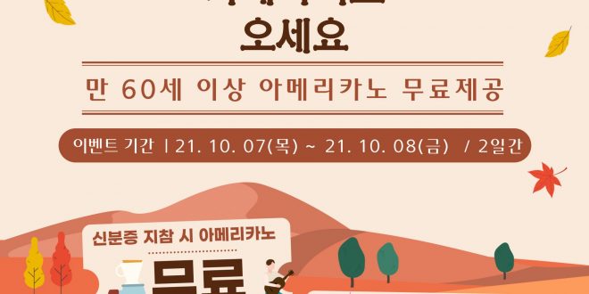 행사 기간은 10월 7일부터 양일간 진행되며, 신분증을 지참한 만 60세 이상 어르신을 대상으로 아메리카노 등 음료 한잔을 1일 1회 무료로 제공할 예정이다.