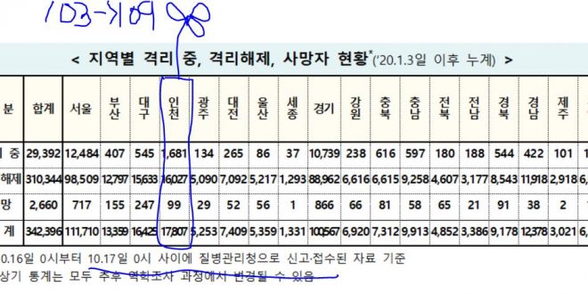 [2021/10/17/0]코로나19인천지수: 확진17,807명*(전일대비 추가 109명:지역감염 109명, 해외유입 0명) * 사망 추가 1며(총99명) [2021/10/17/0]코로나19인천지수: 확진17,807명*(109명:해외0명,지역109명),격리1,681명(2명),완치퇴원16,027명(106명),사망99명(1명) [전국] 코로나19 사망: 전일대비 추가 16명(누적 2,660명, 치명율 0.78%). 2020. 1. 3. 이후. [질병관리청]