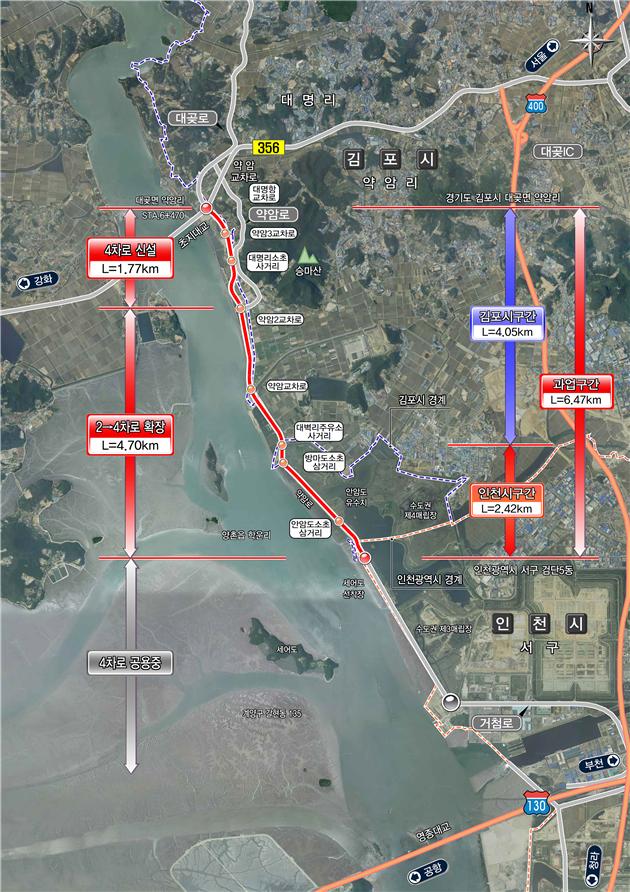 사업구간은 인천 서구 거첨도부터 김포시 약암리(초지대교)까지 6.47km이며, 4.7km는 기존 2차로에서 4차로로 확장하고 1.77km는 4차로 도로를 신설하는 사업으로 총 466억 원이 투입된다.