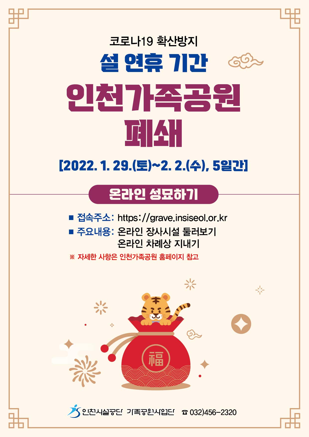 올 설명절기간 1월 29일부터 2월 2일까지 화장장을 제외한 인천가족공원 전 시설이 ‘잠시 멈춤(임시 폐쇄)’에 들어간다.