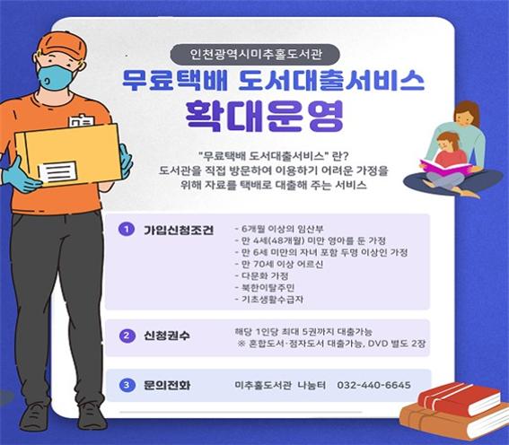 한편 무료택배 도서대출 회원 가입은 신청서와 관련 증빙서를 지참해 도서관을 방문하거나 이메일(michuhollib@korea.kr)로 신청 가능하고, 기타 자세한 사항은 미추홀도서관 홈페이지(www.michuhollib.go.kr) 공지사항을 참고하거나 전화(☎032-440-6645)로 문의하면 된다.