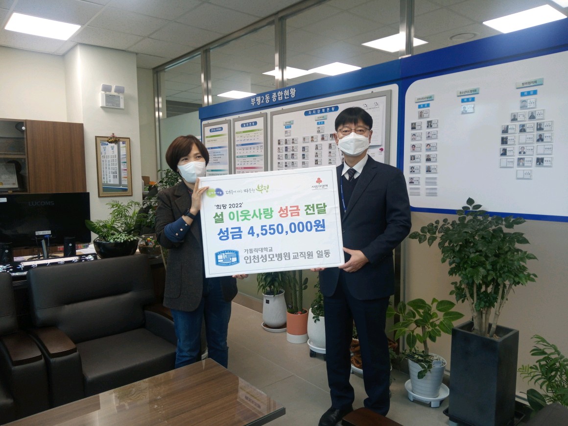 부평2동은 25일 가톨릭대학교 인천성모병원으로부터 ‘설 이웃사랑 나눔’ 성금 455만 원을 기탁 받았다.