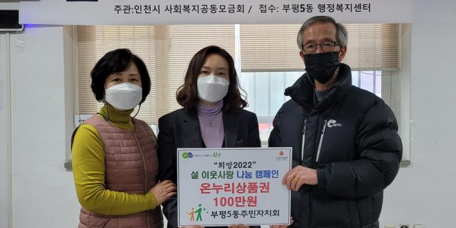 부평5동은 지난 25일 주민자치회로부터 설 명절 이웃사랑 나눔 성금으로 재래시장 상품권 100만 원을 전달받았다.