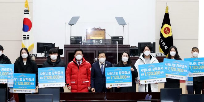 인천시의회는 지난 2008년부터 14년 동안 전체 시의원들이 자발적으로 매월 5만 원씩 ‘사랑 나눔 장학금’을 조성했다.