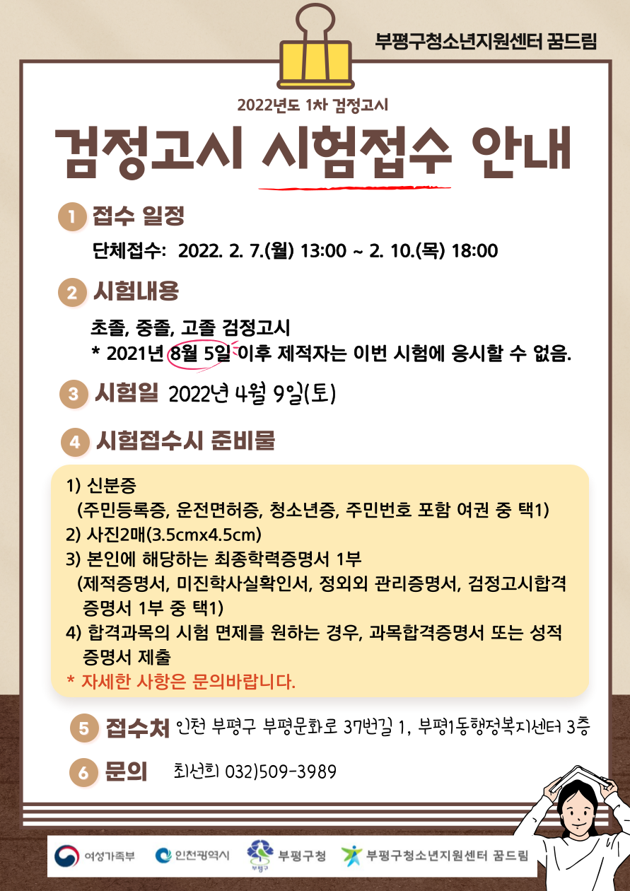 부평구청소년지원센터 꿈드림이 오는 10일까지 2022년 제1회 검정고시 원서를 접수 받는다.