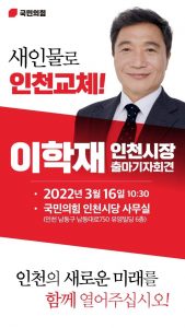 이학재 전 의원은 3월 16일 오전 10시 30분 국민의힘 인천시당에서 인천시장 출마 선언 기자회견을 가질 예정이다.
