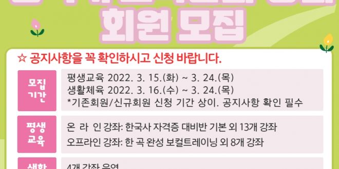 이번 봄학기 교육문화 프로그램은 4월부터 6월까지 3개월 프로그램으로 진행하는 평생교육강좌(한국사자격증 대비반 기본 포함 13개 강좌)와 코로나19 확산 관련 안전한 운영을 위해 1개월 단위로 접수 및 운영하는 생활체육강좌(토요 배드민턴 포함 4개 강좌)로 운영한다.