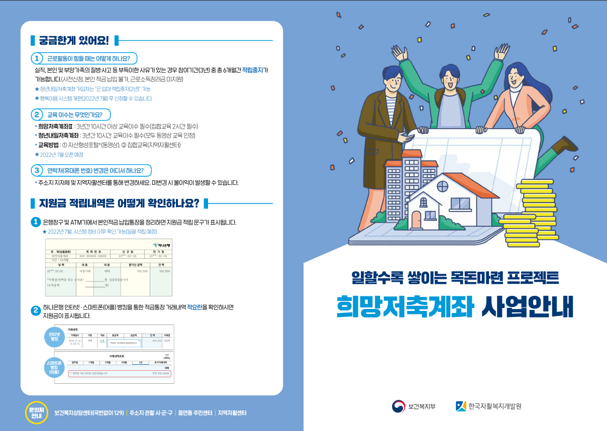 희망저축계좌 신청은 오는 19일까지(희망저축계좌Ⅰ은 20일까지)며, 접수기간 내에 주소지 관할 행정복지센터를 방문해 접수하면 된다.