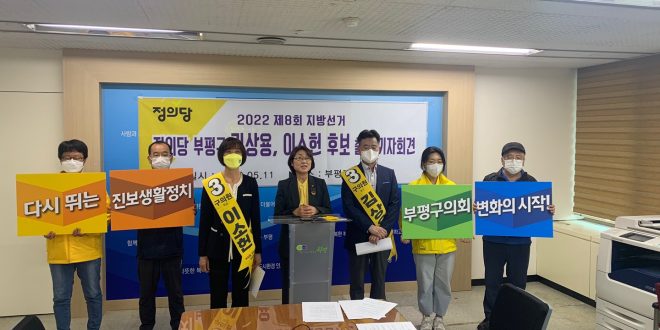 12일 부평구 구의회 후보로 나선 정의당 김상용, 이소헌 후보가 함께 출마기자회견을 부평구청 브리핑룸에서 가졌다.