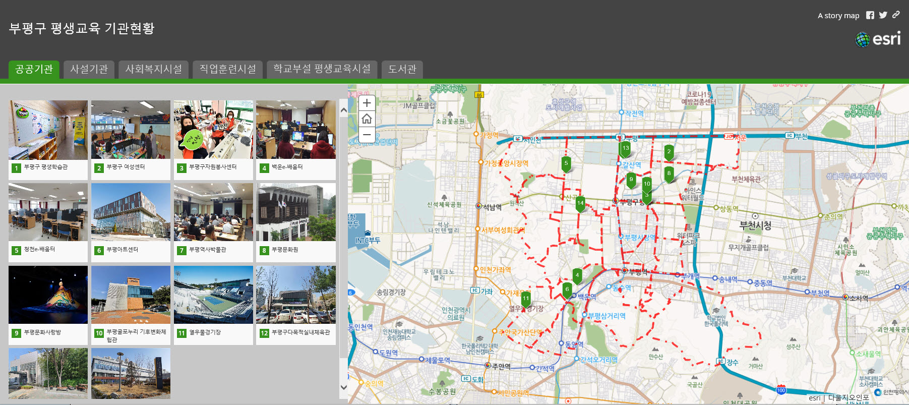 이번 프로그램은 평생교육 서비스를 제공하는 ▲공공기관 ▲사설기관(인천북부교육지원청 평생교육시설 등록 기준) ▲직업훈련시설 ▲사회복지시설 ▲도서관 ▲대학 등 104개 기관 및 시설의 정보를 지도 콘텐츠로 제작해 한 눈에 찾아볼 수 있도록 한 서비스다.