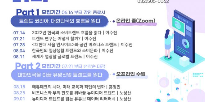 1부 강연은 ‘트렌드 코리아, 대한민국의 흐름을 읽다’라는 주제로 14일부터 8월 11일까지 매주 목요일 오후 7시에 비대면으로 진행한다. 강연은 5회에 걸쳐 도서 ‘트렌드 코리아 2022’의 공동 저자인 서울대 소비트렌드분석센터 이수진 연구위원과 함께 올해 한국의 소비문화를 살펴보고, 앞으로의 라이프스타일과 글로벌 트렌드를 전망한다.