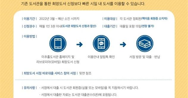 미추홀도서관(책이음) 회원이면 누구나 도서관 홈페이지 또는 모바일 앱을 통해 도서 신청이 가능하며, 이용 안내 알림 톡을 받은 후 해당 서점을 방문하면 된다. 매월 1인당 3권까지 신청할 수 있고, 대출일 포함 15일간 이용할 수 있다.
