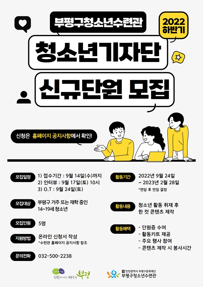 부평구청소년수련관이 오는 9월 14일까지 ‘2022 청소년기자단 에디트’ 하반기 신규단원을 모집한다.
