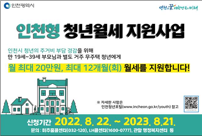 인천시는 경제적 어려움을 겪는 저소득 청년들의 주거비 부담 경감을 위해 ‘인천형 청년월세 지원’사업을 실시한다고 밝혔다. 신청접수는 오는 22일부터 내년 8월 21일까지다.