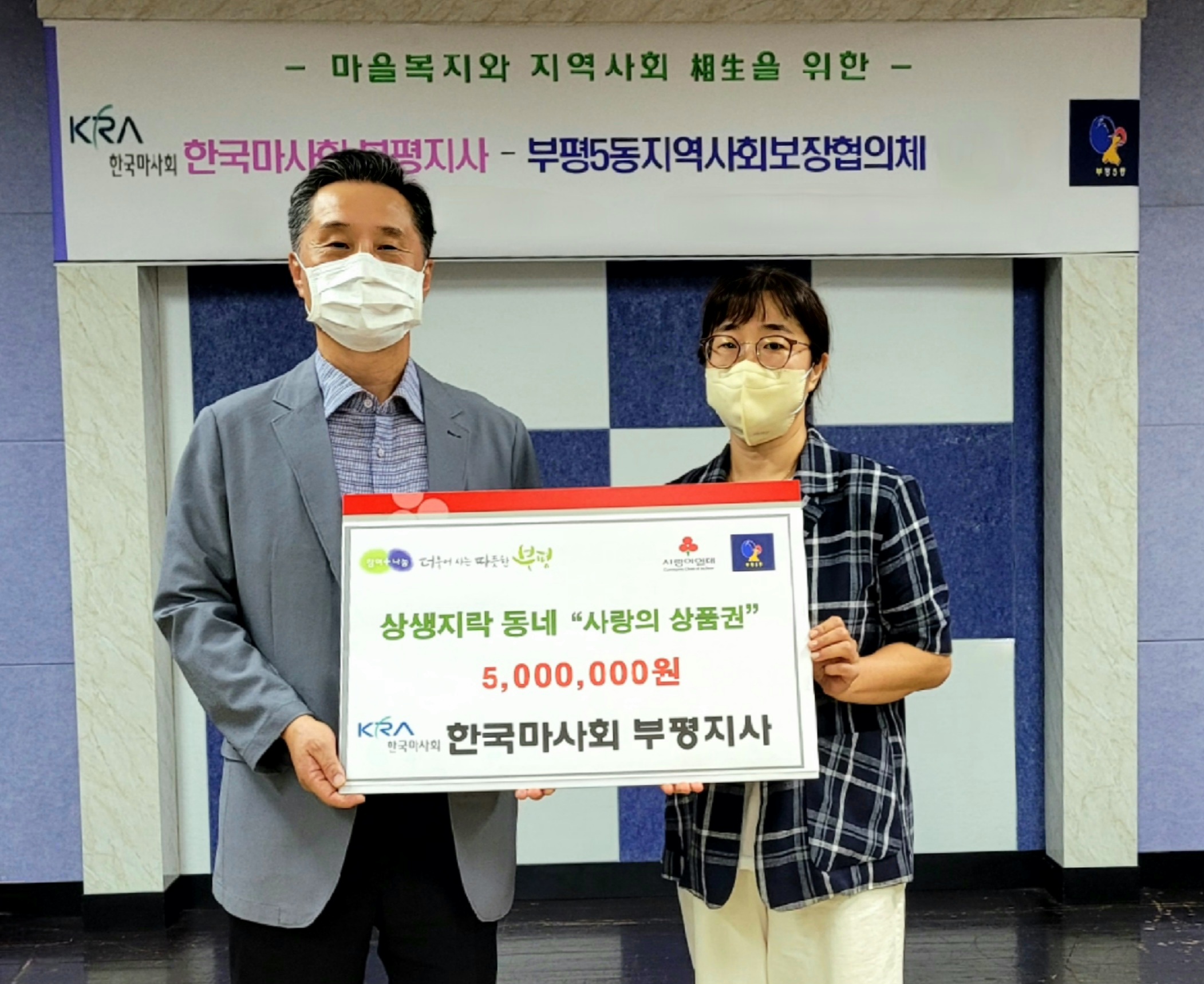 부평5동은 지난 19일 한국마사회 인천부평지사로부터 지역 내 저소득 주민을 위한 온누리상품권 500만 원을 기탁 받았다.