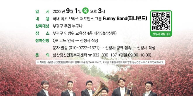 부평구 민방위 교육장 대강당에서 열리는 이번 음악회는 코로나19로 지친 지역 주민들의 회복을 돕고 생명의 소중함을 몸소 실천하며, 자살예방활동에 적극 동참할 수 있는 동기를 부여하기 위해 마련됐다.