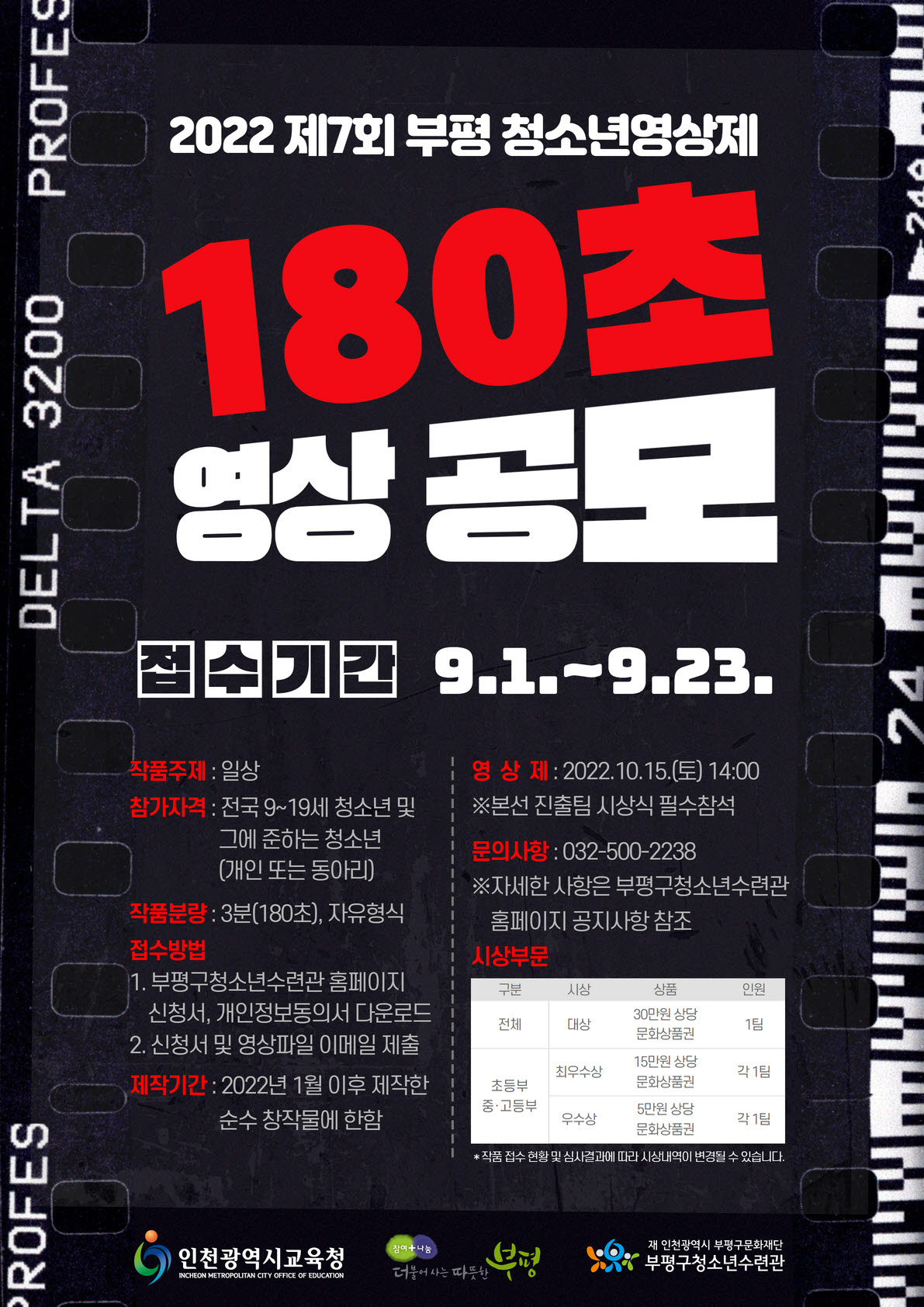 박건호 청소년수련관장은 “청소년들이 미디어 창작성과 재능을 키울 수 있는 기회를 제공하고자 7년째 부평 청소년영상제를 열고 있다”며 “재미있고 다양한 작품들이 많이 출품되길 바란다”고 말했다.