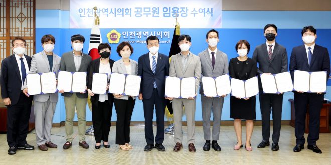 인천시의회는 5일 의장 접견실에서 정책지원관(일반임기제) 채용시험에 최종 합격한 9명에 대한 임용장을 교부했다.
