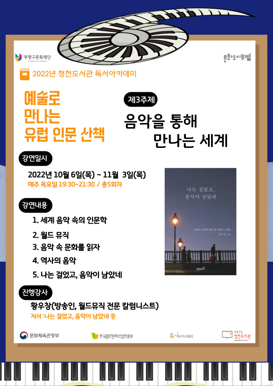 청천도서관은 2022년 독서아카데미 ‘예술로 만나는 유럽 인문 산책: 음악을 통해 만나는 세계’ 수강자를 선착순으로 모집한다.