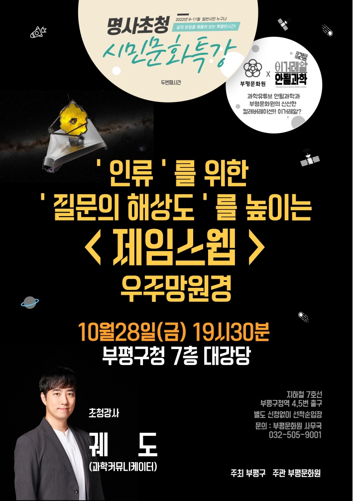 이번 시민문화특강은 ‘인류를 위한 질문의 해상도를 높이는 제임스웹 우주망원경’이라는 주제로, 과학커뮤니케이터 궤도를 강사로 초빙해 2시간가량 강의한다.
