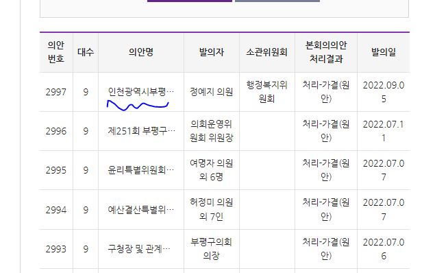 현재 부평구의회 홈페이지에서는 확정된 의안정보만 확인 가능하다. 그나마 이 정보도 의안 제목이 부분적으로 노출되어 한 눈에 파악이 되지 않아서 불편한 상태다.