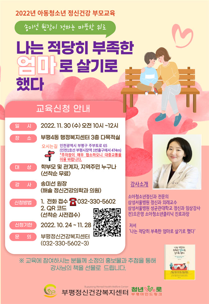 이번 교육은 오는 30일 부평4동 행정복지센터 다목적실에서 ‘나는 적당히 부족한 엄마로 살기로 했다’ 저자인 송미선 원장이 강연한다.
