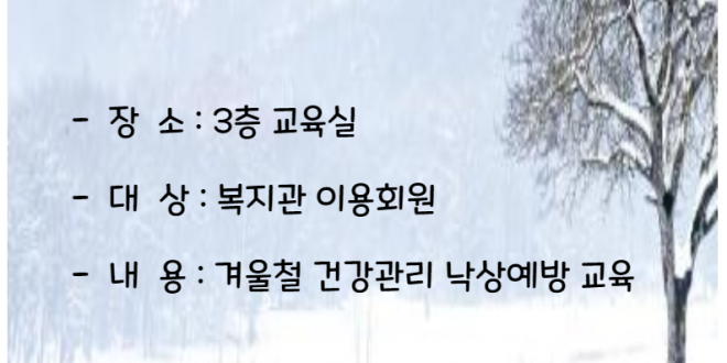 교육은, 어르신들의 낙상사고 예방을 위해 준수 사항과 대처방법을 안내하여 안전한 겨울나기를 지원하며 개인의 건강관리 능력을 증진시키고 건강하고 활력 있는 삶을 도모하고자 하는 취지다.