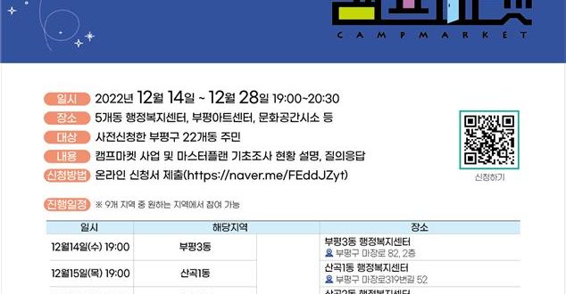 부평구 22개 동을 9개* 그룹으로 나눠 오는 12월 14일부터 28일까지 제1회차 숙의경청회를 9차례 진행하고, 여기서 논의된 내용과 결과를 반영해 내년 2~3월 경 2회차 숙의경청회(9회)를 진행할 계획이다.