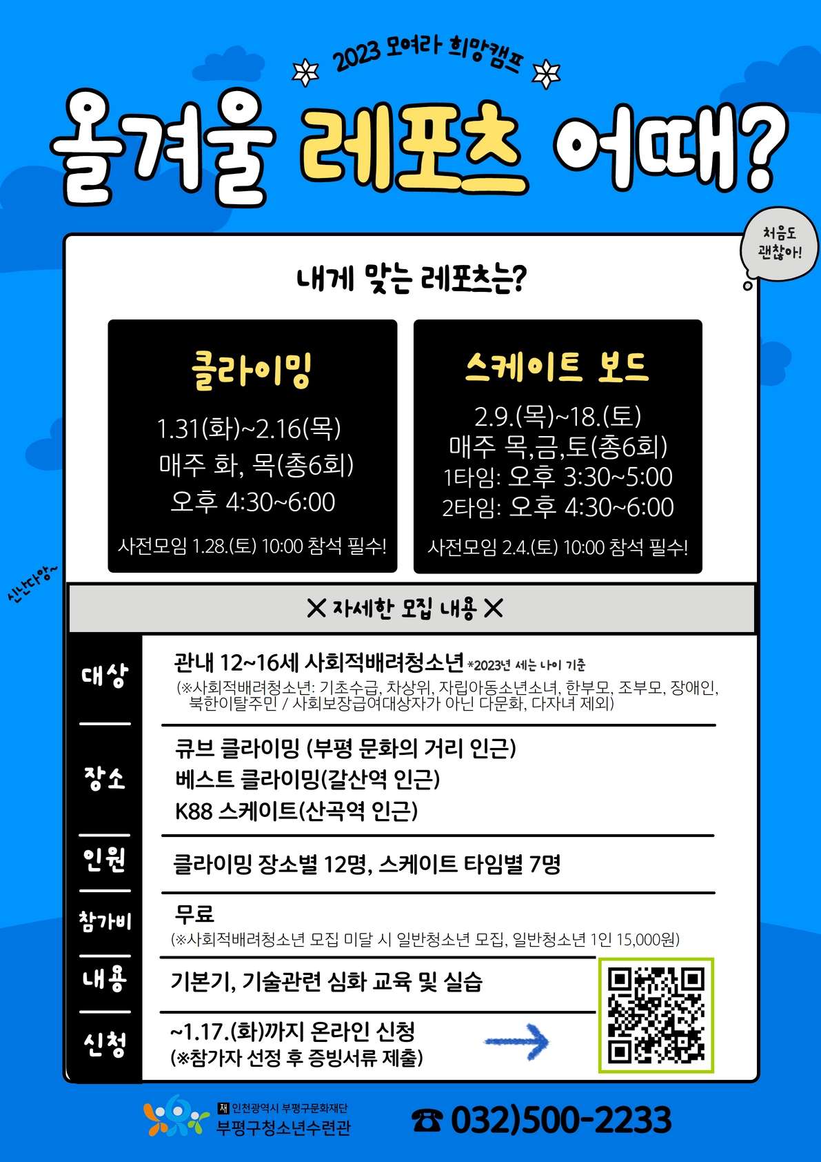 부평구청소년수련관이 오는 17일까지 2023 모여라희망캠프 ‘올겨울 레포츠 어때?’ 참가자를 모집한다.