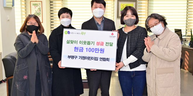 by 김성화 기자 최근 10일 부평구는 부평구 가정어린이집 연합회로부터 설맞이 이웃돕기 성금 100만 원을 전달받았다. 이번 성금은 가정어린이집 연합회 회원들이 지역의 어려운 이웃을 돕고자 마련했다. 양향숙 가정어린이집 연합회장은 “어려운 이웃들에게 조금이나마 따뜻한 마음을 나눌 수 있게 돼 기쁘다”고 말했다.