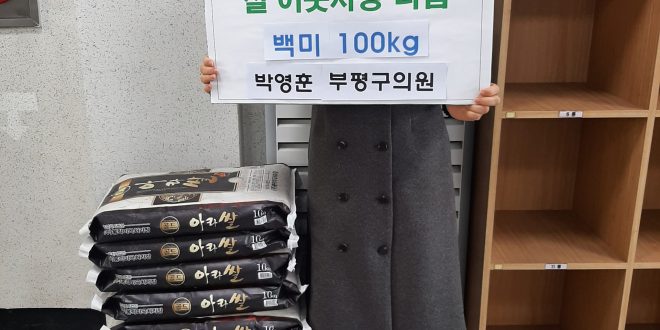 김재수 산곡4동장은 “지난해 기부에 이어 올해도 사랑의 쌀 기부로 나눔 활동에 앞장서 준 박영훈 의원께 감사하다”며 “따뜻한 마음이 담긴 사랑의 쌀은 지역 내 취약계층에게 소중하게 전달하겠다”고 말했다.