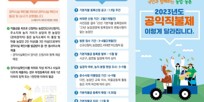 이에 따라 전국적으로 56만 농업인의 신규 진입이 예상되며, 부정수급 방지를 위해 농림축산식품부 공익직불사업 시행지침에 따라 경작사실확인서 발급기준을 강화했다.