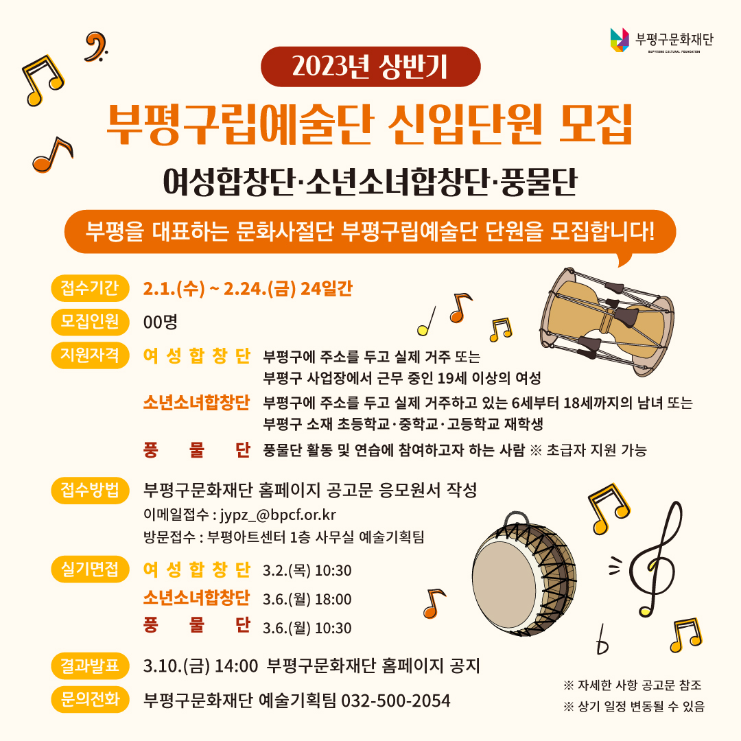 전형 방법은 실기·면접으로 진행되며, 풍물단 초급 지원자는 면접으로 대체한다. 여성합창단은 오는 3월 2일 부평아트센터 중연습실, 소년소녀합창단은 3월 6일 부평아트센터 중연습실, 풍물단은 3월 6일 부평생활문화센터 오픈스페이스에서 진행한다.