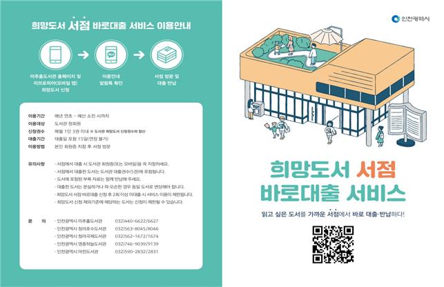 8일 인천시는 미추홀도서관 및 분관(청라호수‧청라국제‧영종하늘‧마전도서관)에서 원하는 책을 무료로 바로 빌려볼 수 있는 ‘희망도서 서점 바로대출’ 서비스를 옹진군을 제외한 9개 군‧구에 위치한 41개 동네서점에서 운영 중이라고 밝혔다.