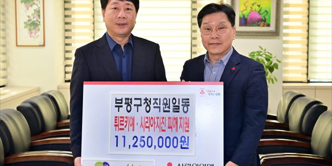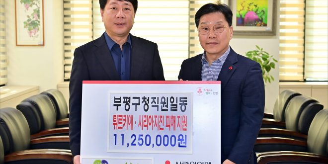 최근 23일 부평구는 구청장 집무실에서 대지진 피해를 입은 튀르키예·시리아를 돕기 위해 구청 직원들이 기부한 성금 1천125만 원을 인천사회복지공동모금회에 기탁했다.