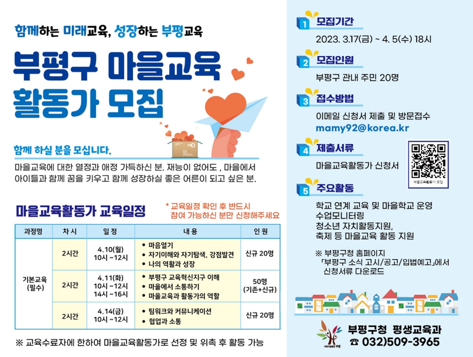 부평구가 오는 4월 5일까지 부평구 마을교육활동가를 모집한다.