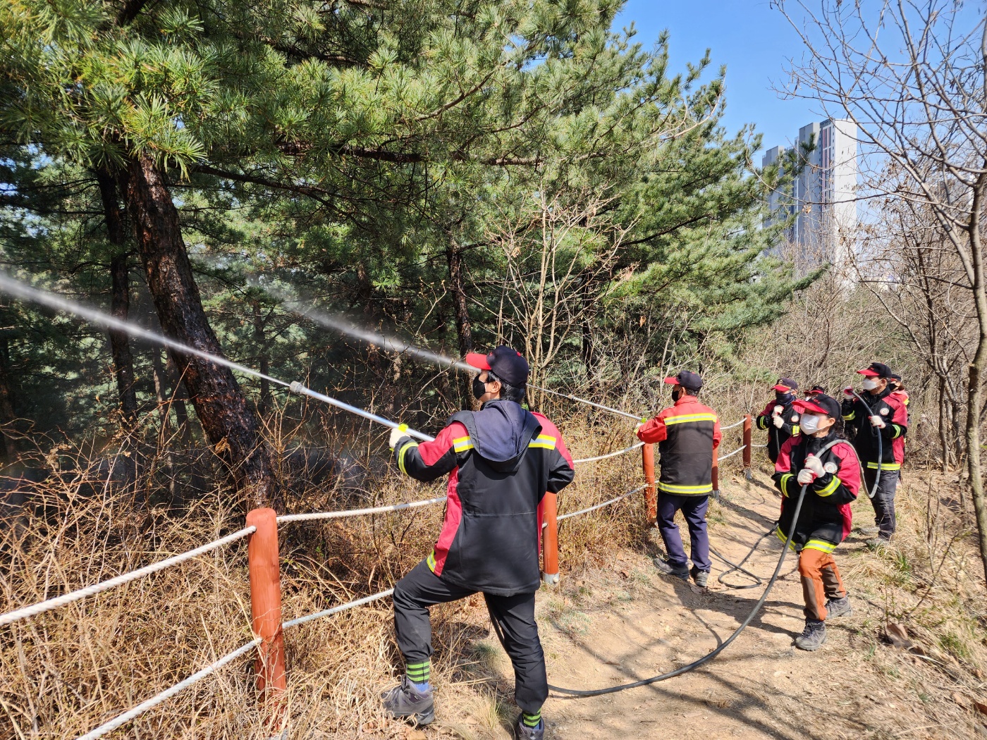 이날 훈련에는 공원녹지과 직원과 산불 예방 인력 등 31명과 산불지휘차량 1대, 산불진화차량 2대, 등짐펌프 30여 개 등이 투입됐다.