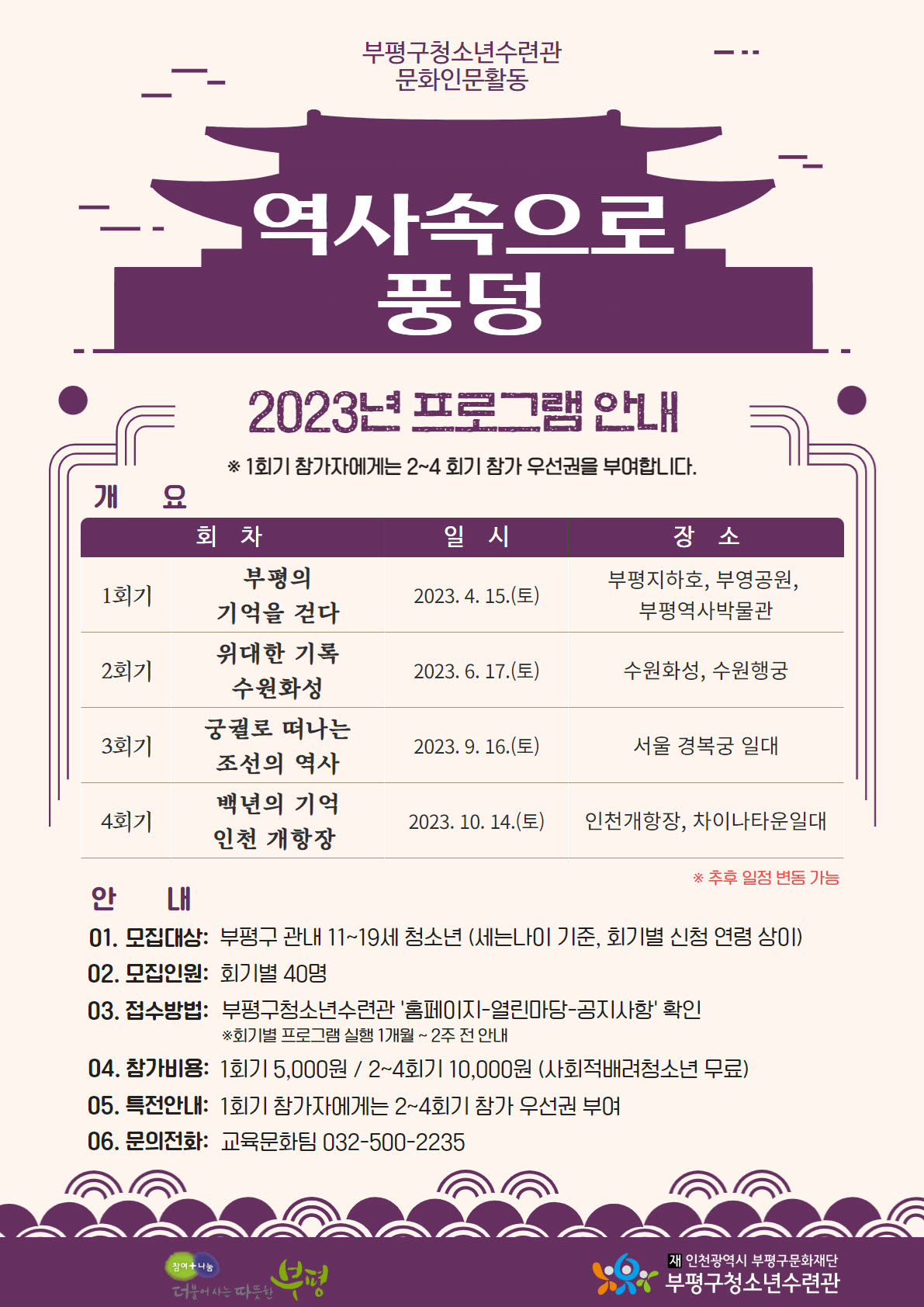부평구청소년수련관이 31일부터 오는 4월 7일까지 문화·인문 역사 탐방 프로그램 ‘역사속으로 풍덩’ 1기 참가자를 선착순으로 모집한다.