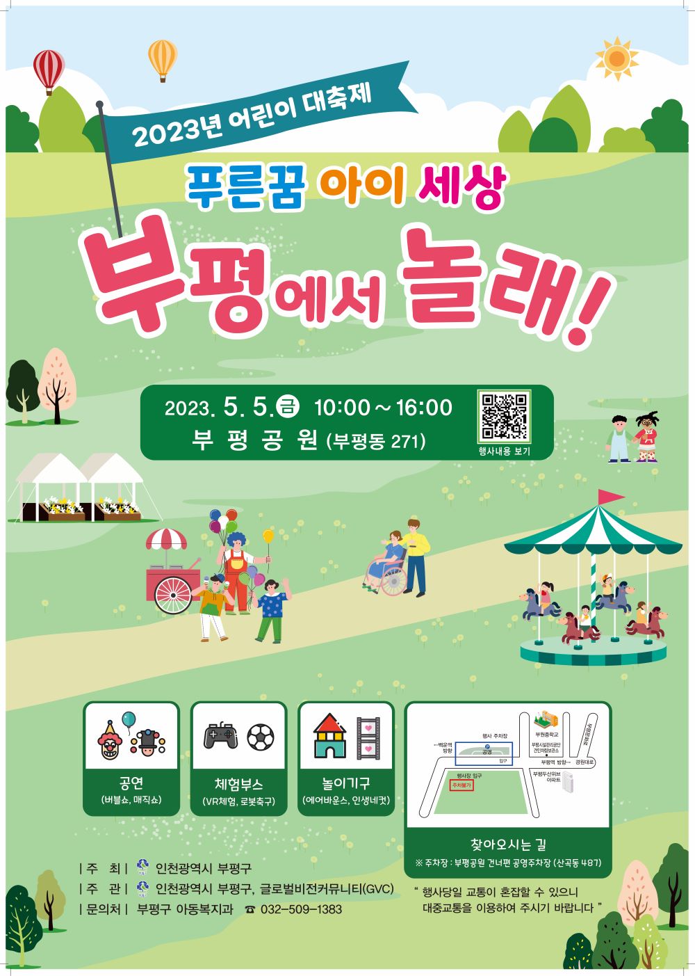 부평구가 오는 5월 5일 부평공원 소나무 광장 일대에서 제101회 어린이날을 맞아 2023년 어린이 대축제, 푸른꿈 아이 세상 ‘부평에서 놀래!’를 진행한다.