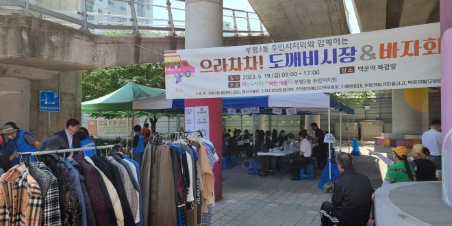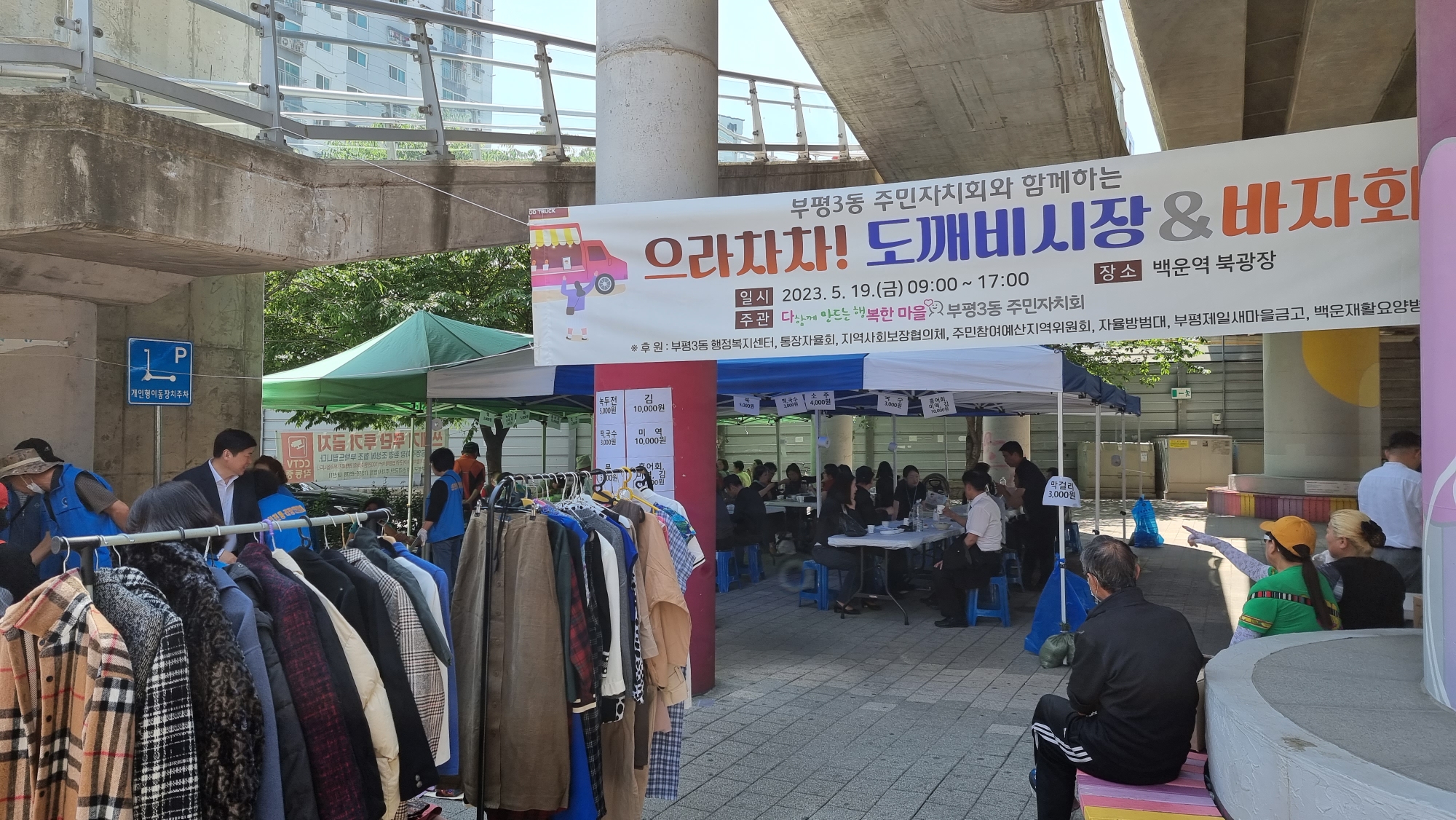 최근 19일 부평3동 주민자치회는 백운고가 하부 백운역 북광장에서 주민 300여명이 참여한 가운데 ‘으라차차! 도깨비 시장’ 바자회를 진행했다.