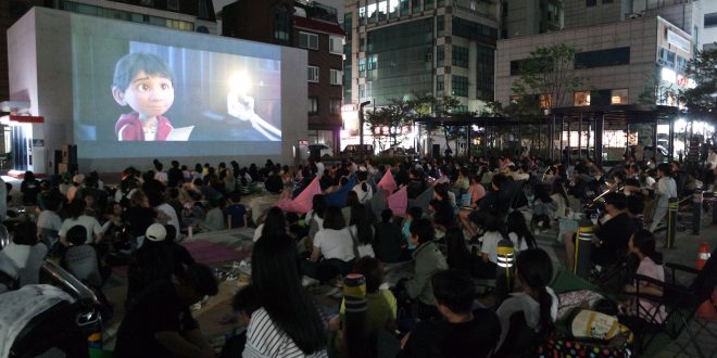 야외 영화 상영회를 주제로 진행한 이번 행사는 갈산동 굴포먹거리타운 중앙광장 내 엘리베이터 타워를 스크린으로 활용했으며, 현장에서 제공된 즉석 팝콘과 함께 영화를 즐겼다.
