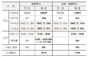 심야시간 20% 할증요금도 현재는 오전 0∼4시에 적용되지만 다음 달 변경 후에는 오후 10시부터 오전 4시까지 2시간 더 확대 적용된다.