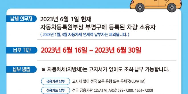 6월 자동차세는 6월 1일 현재 자동차등록원부상 부평구에 등록된 자동차 및 건설기계 소유자에게 부과되며, 납부 기간은 6월 16일부터 6월 30일까지다. 단, 1월과 3월 자동차 연 세액을 일시납부한 차량은 과세대상에서 제외된다.