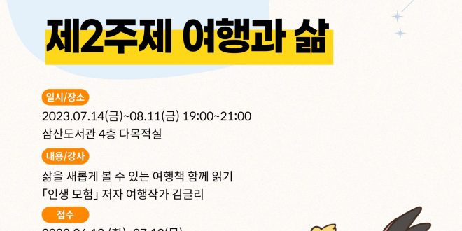 한편, 삼산도서관은 7월 7일까지 김다영 작가와 함께 새로운 여행이라는 주제로 새롭게 변화하는 여행트렌드를 알아보는 강의를 진행하고 있다.