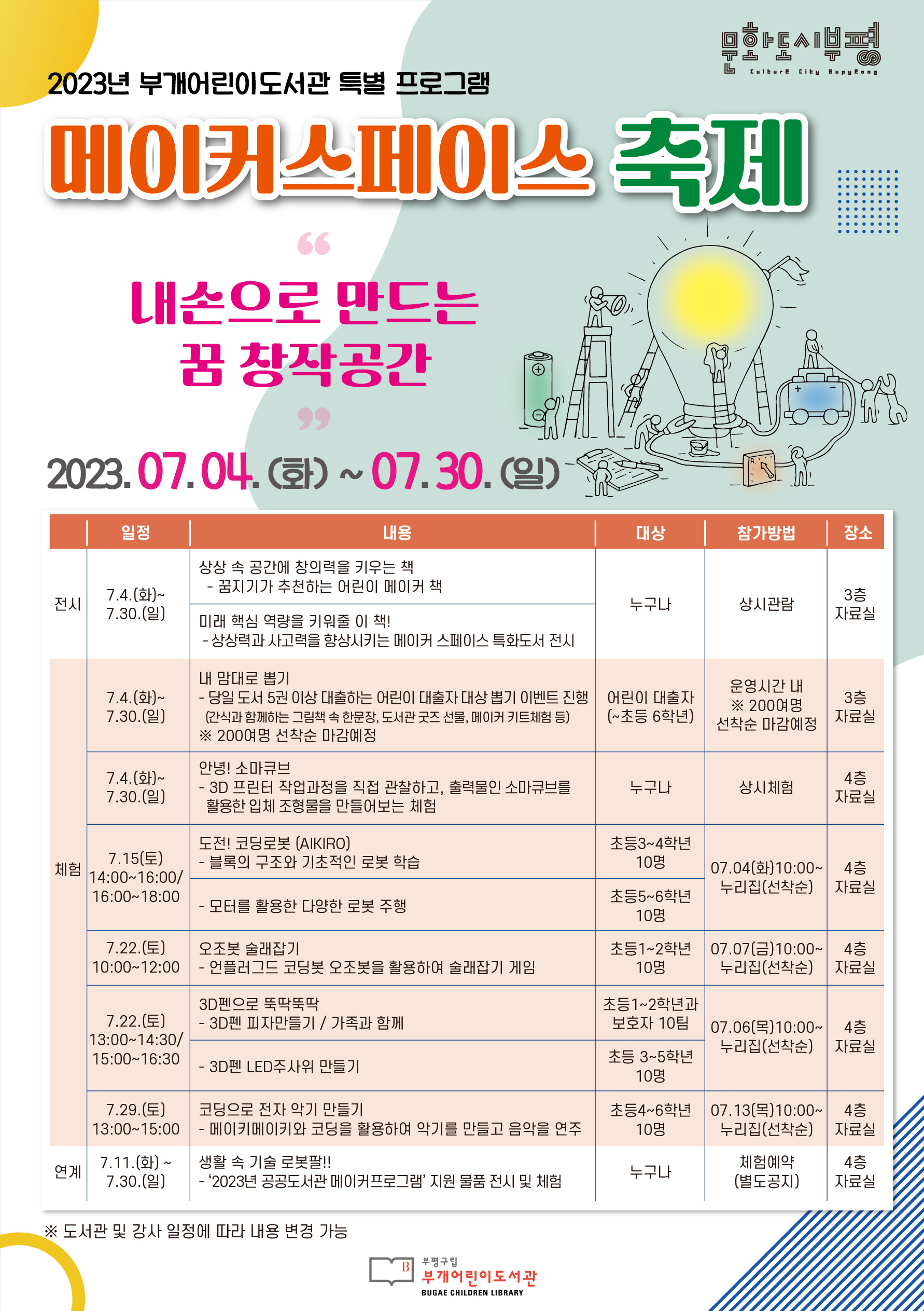 부평구 부개어린이도서관은 오는 30일까지 다양한 메이킹 활동을 체험하는 ‘메이커스페이스 축제’를 개최한다.