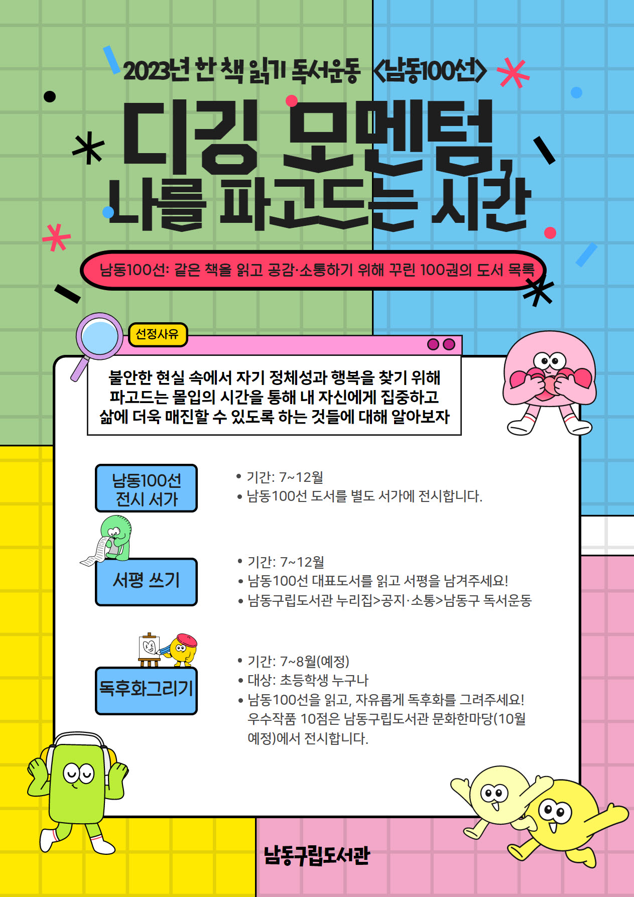 이를 위해 남동구립도서관은 자료관리심의회를 통해 ‘디깅 모멘텀, 나를 파고드는 시간’이란 주제로 남동 100선을 심의·선정했다.