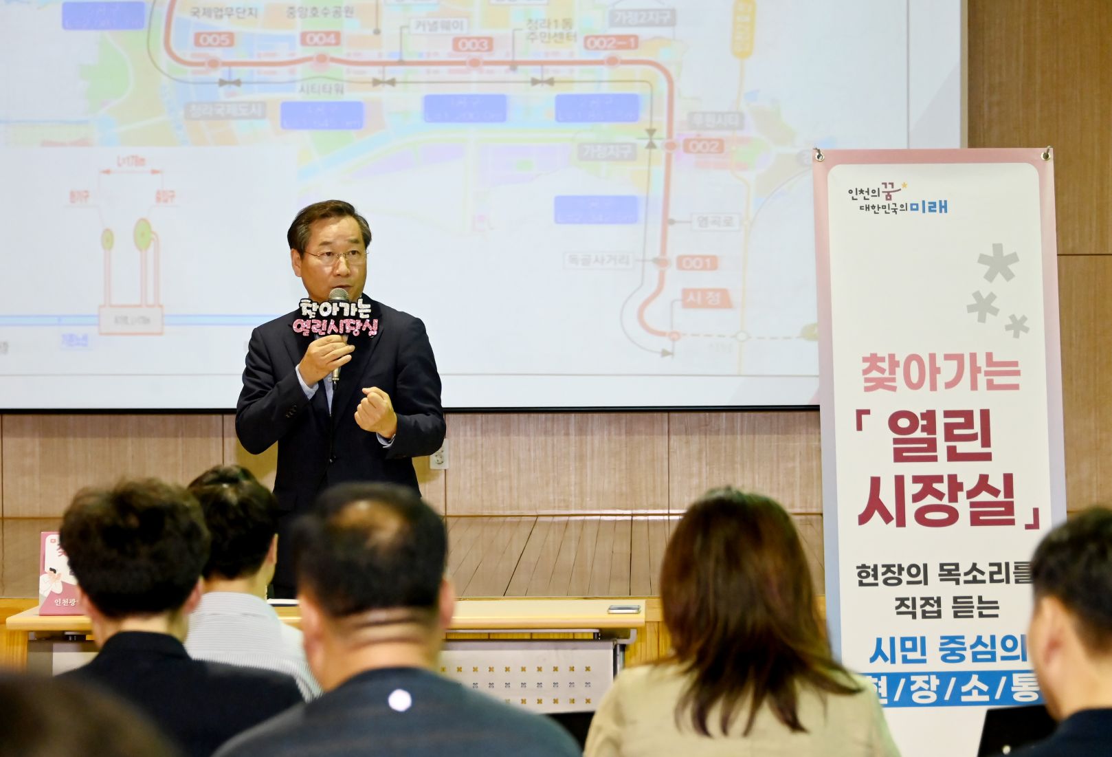 한편, ‘찾아가는 열린 시장실’은 온라인을 통해 다수 시민 의견을 수렴하고 직접 현장에 찾아가 시민 의견을 청취해 시정에 반영하는 소통·공감 행정으로, 시민의 의견에 3천 명 이상이 공감하면 공식 답변하는 방식으로 운영된다. 답변내용은 ‘인천은 소통이 가득’ 사이트 (https://www.incheon.go.kr/cool/indexr) 열린 시장실에서 확인할 수 있다.