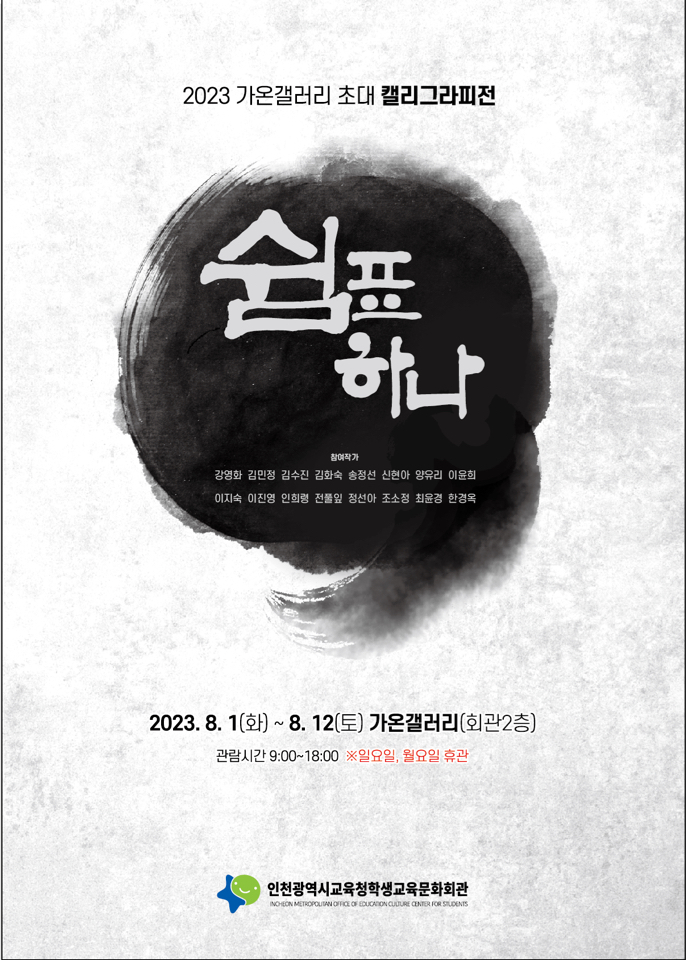 학생교육문화회관(관장 김호섭)은 가온갤러리에서 ‘캘리그라피전, 쉼표 하나’를 8월 1일부터 12일까지 전시한다.